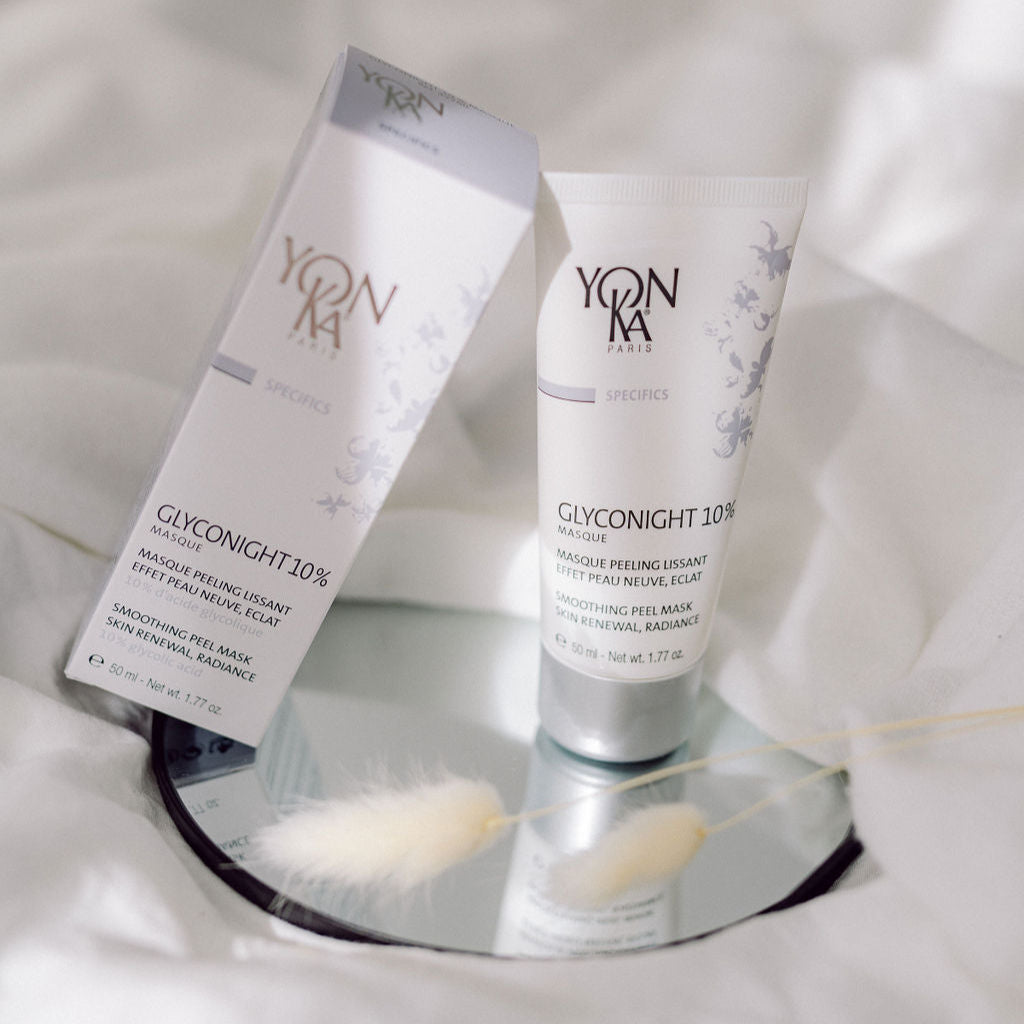 Yon-Ka Glykonight naamion annetaan vaikuttaa yön aikana. Hoitonaamio sisältää 10 % glykolihappoa, joka kuorii ihoa turvallisesti ja hellävaraisesti. Jo ensimmäisistä käyttökerroista lähtien tämä ihon uudistumista edistävä naamio kirkastaa ihoa merkittävästi. Heleyttävä naamio yöksi = aamuksi kirkkaampi iho. Naamio voi silottaa myös kevyitä juonteita.